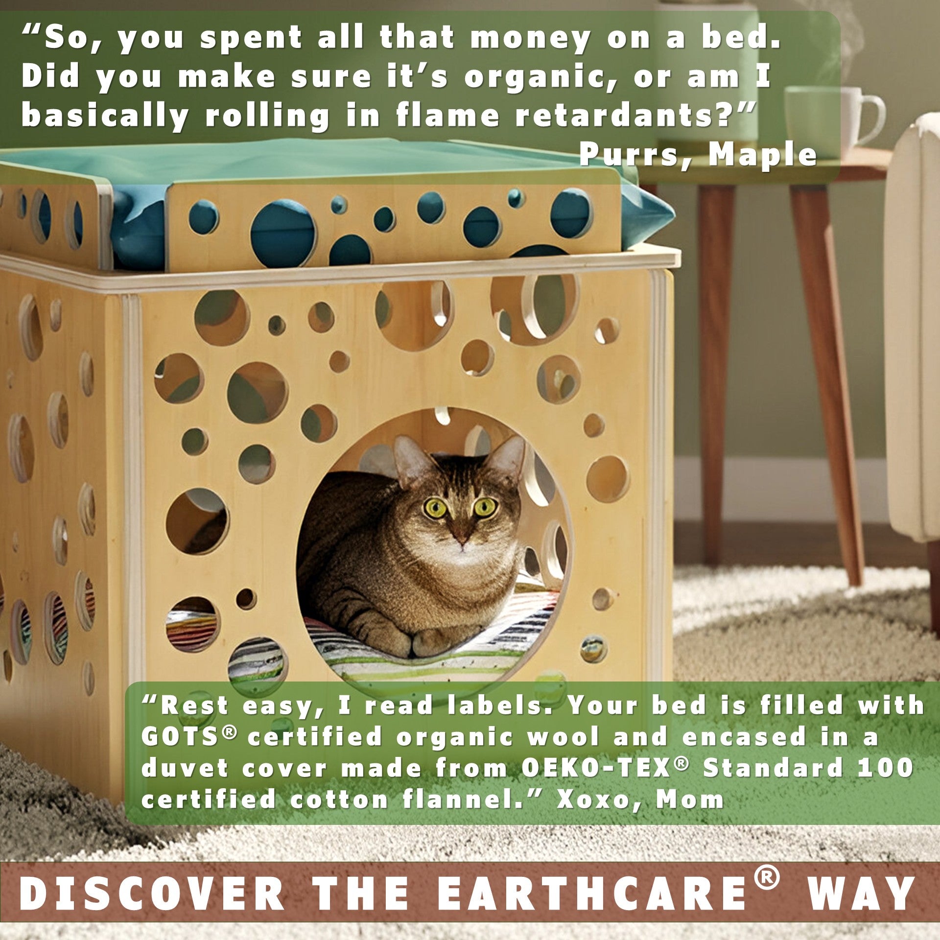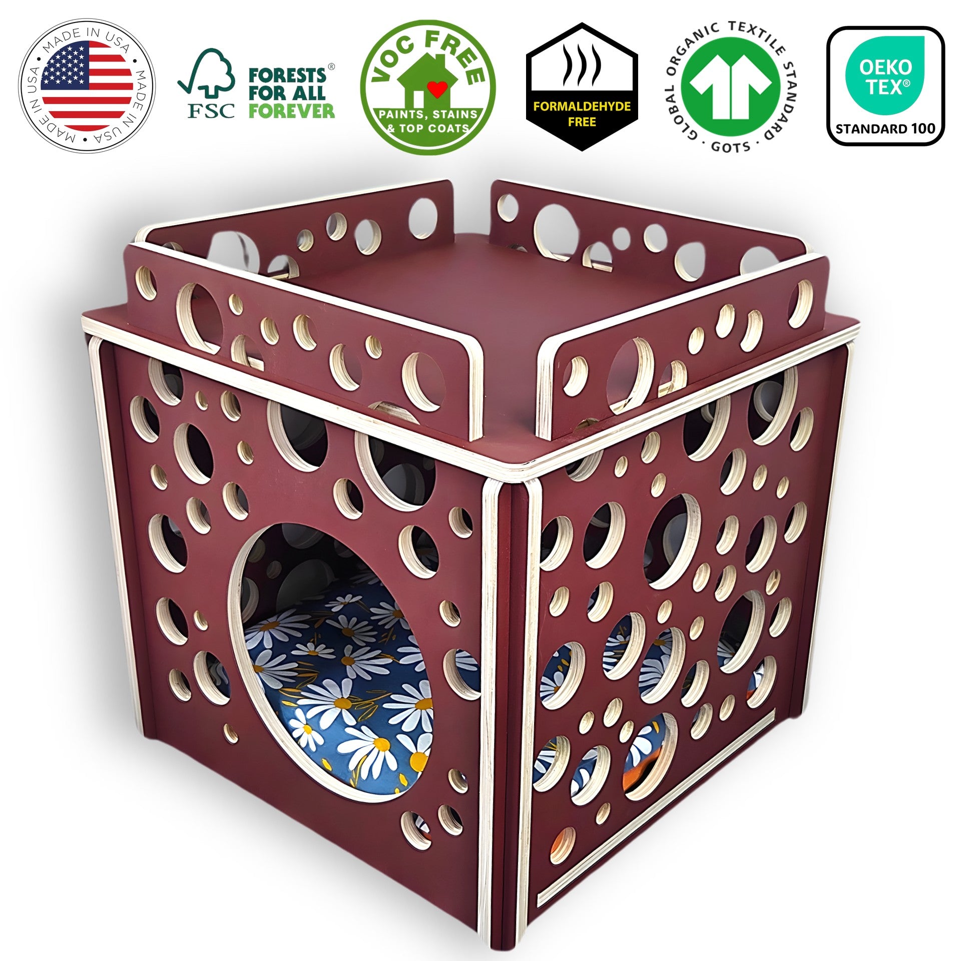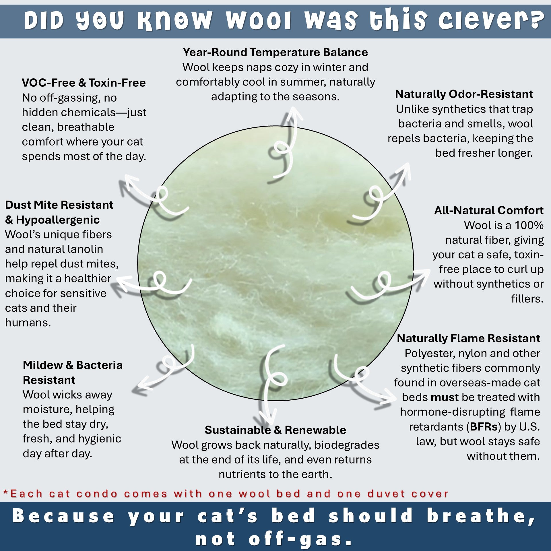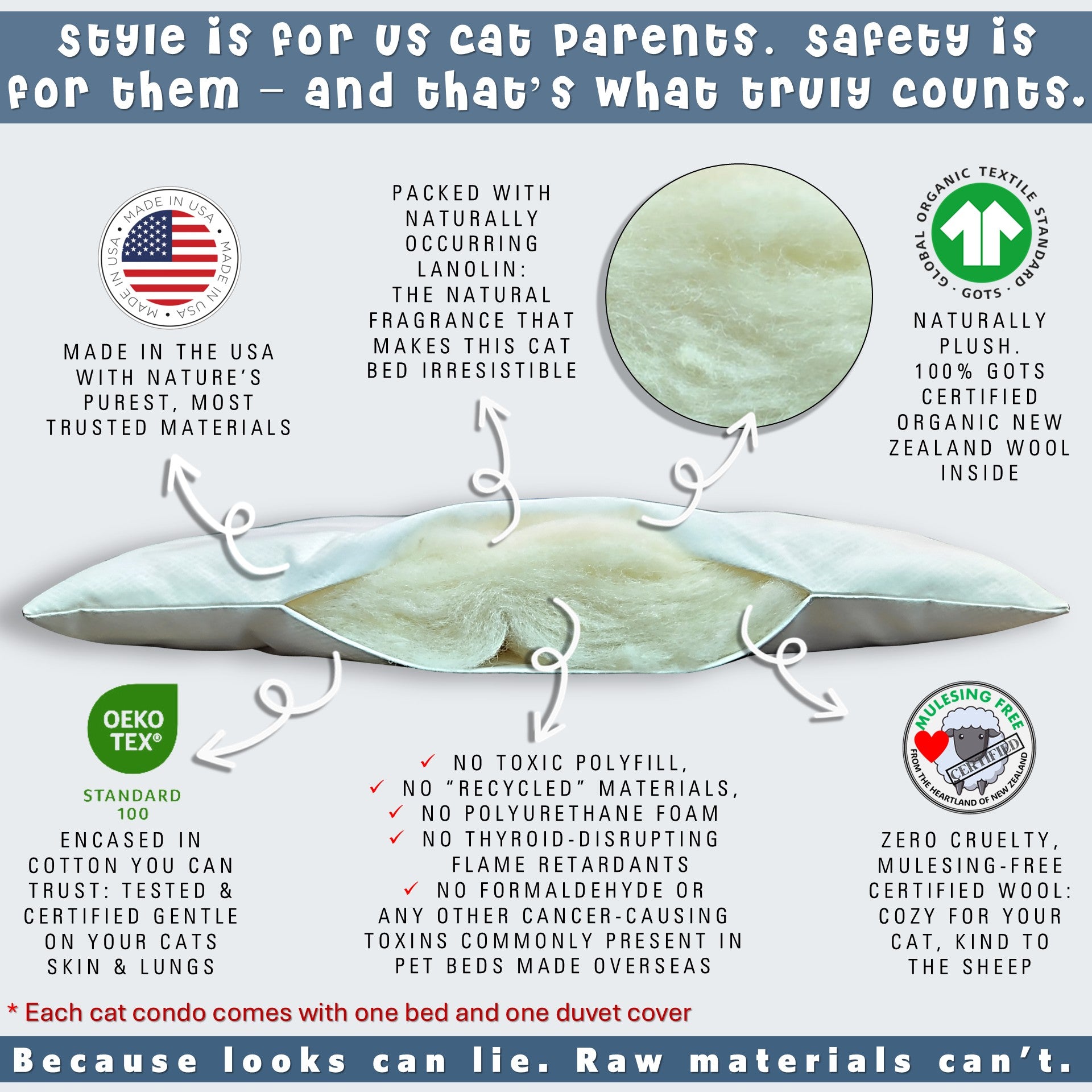 The Lunar Loungeā„¢ Cat House is made from FSCĀ® certified wood and GOTSĀ® and OEKO-TEXĀ® certified wool and fabrics. Hypoallergenic and rigorously tested by independent third parties, every component minimizes VOCs and allergens, supporting respiratory health, immune wellness, and safe exploration for outgoing, active cats.